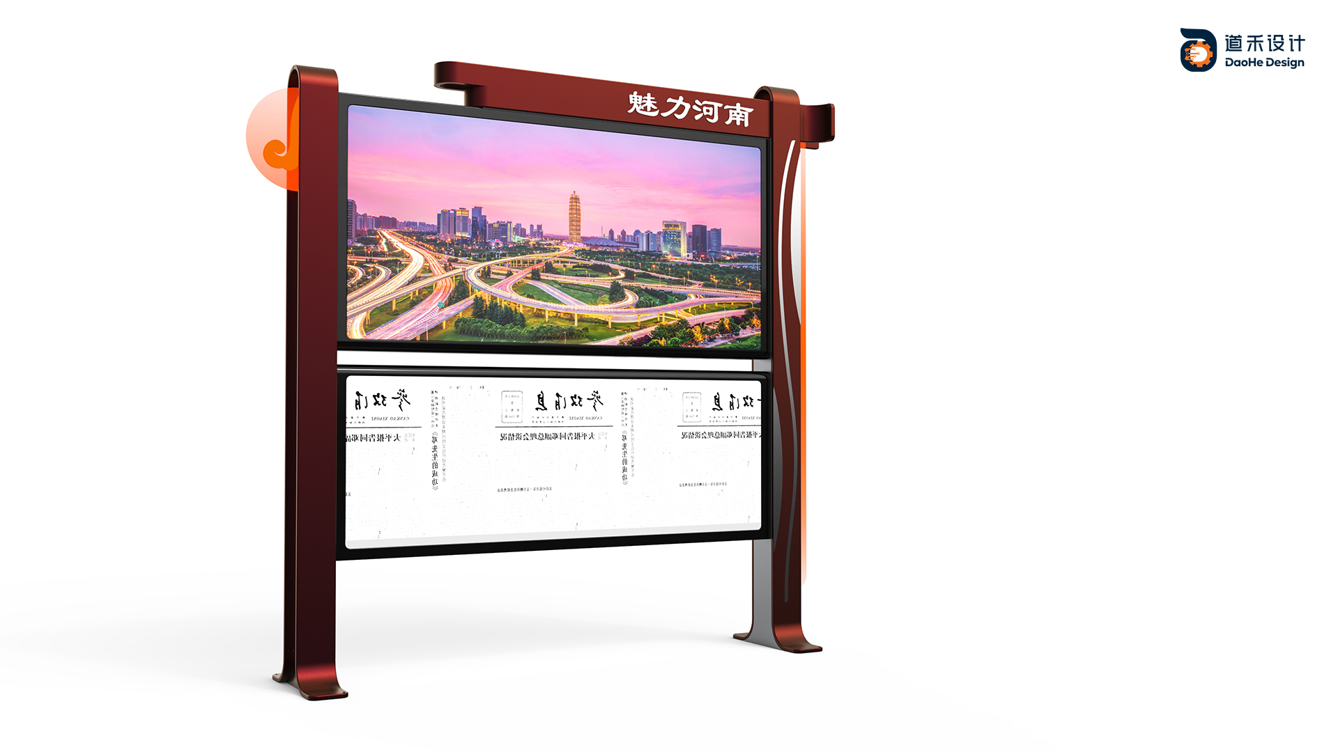 由洛神守护的洛水,坐落于河南大地,而同其“飞天”一般,飘散的飘带,如梦如幻,轻盈多变,我们的方案则由此而生。结合着飘带变化飘逸的质感,我们将原本坚硬的材料通过圆角,以及形态的穿插的方式,达到对于此状态的复刻。