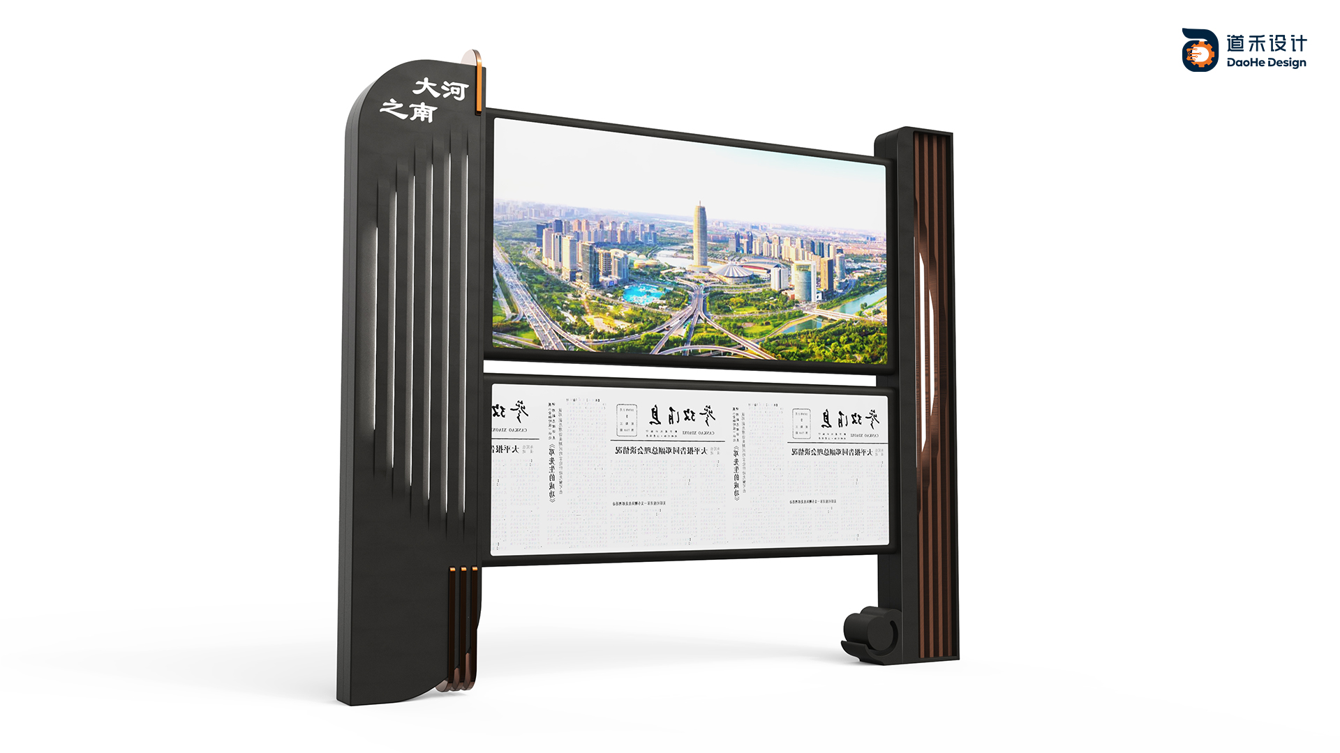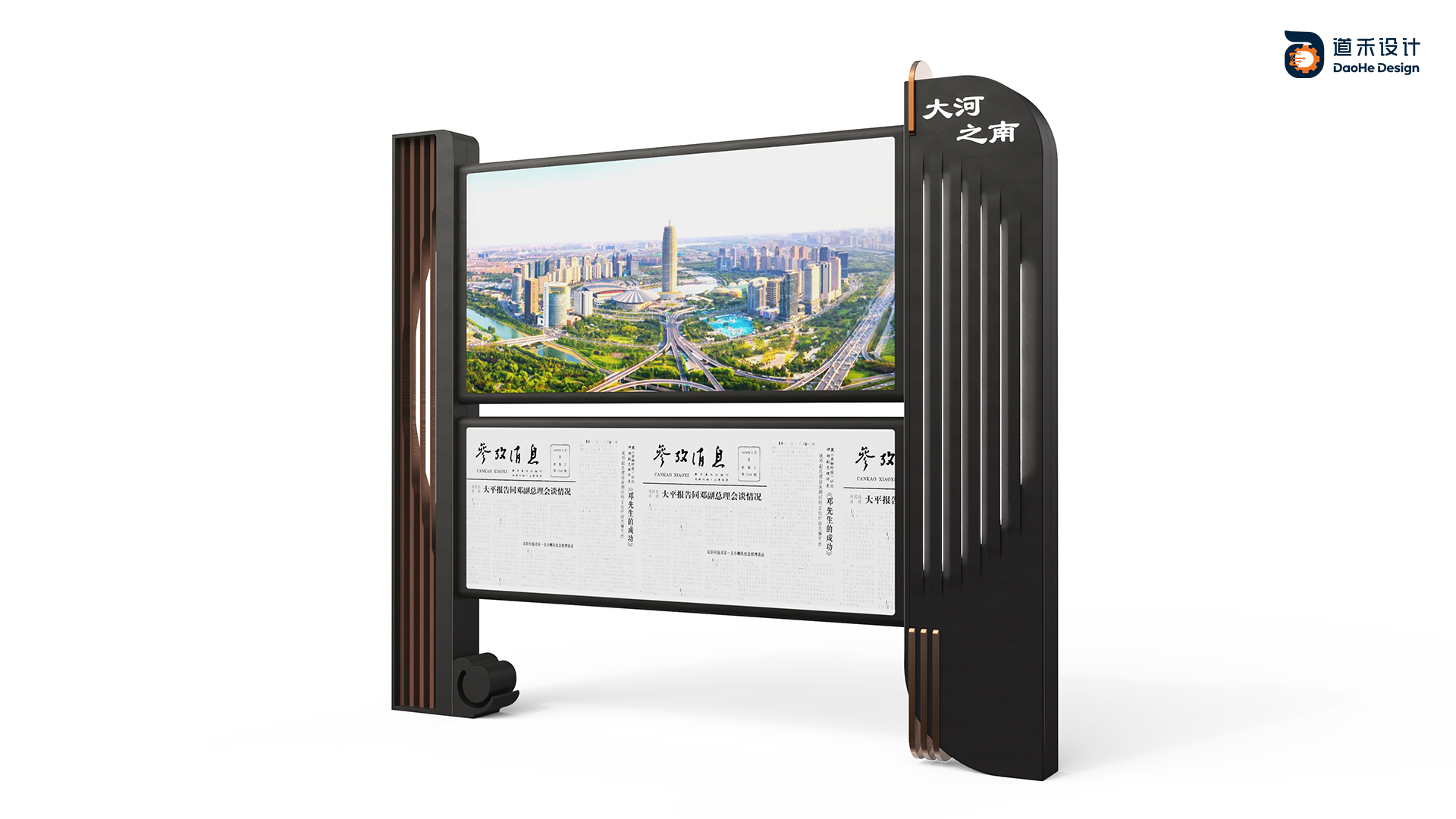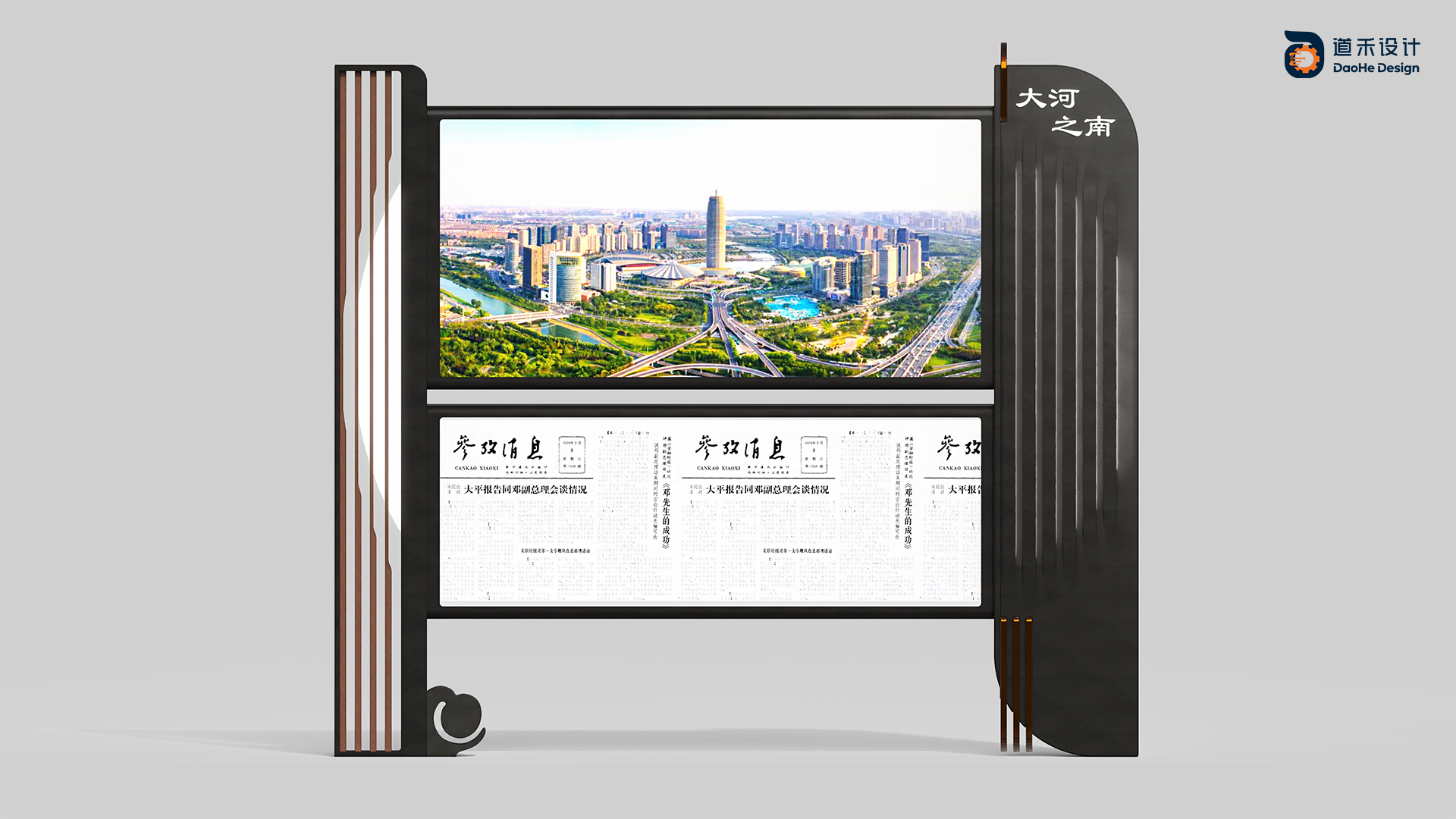 洛阳宫灯的纹样多而繁复。充满趣味。这样的文化遗产,是生活与艺术的结合。 阅报栏左右两侧通过设计的手法,分别表现出,传统木制灯笼(左侧)与现代“灯笼”(右侧)的变化与迭代。左侧木制造型,利用形态的切割,结合灯光的设计,通过艺术的手法表现出传统文化中灯笼的材质与其状态。